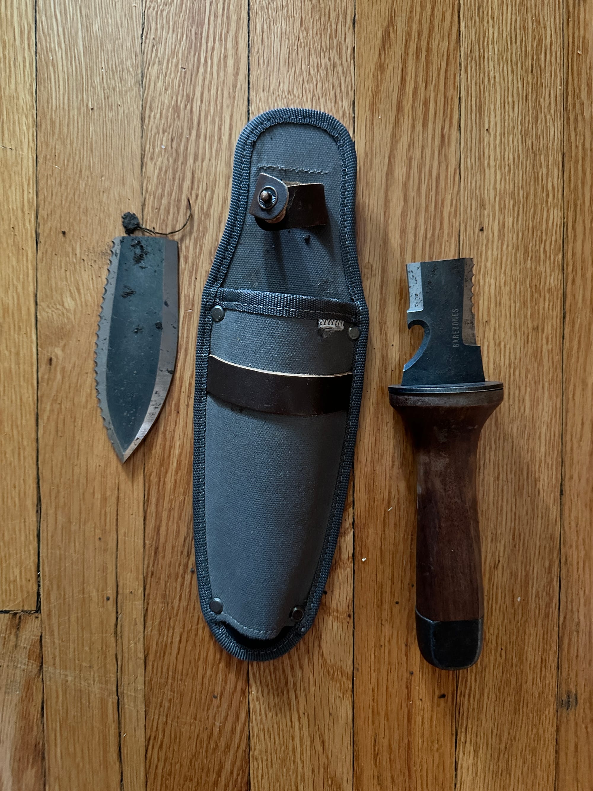 - A blade-like spade with a pointed end, sharp edge, and serrated edge. Ideally the blade extends from the tip to the base of the handle (not just attached at the handle, which will break really easily).
